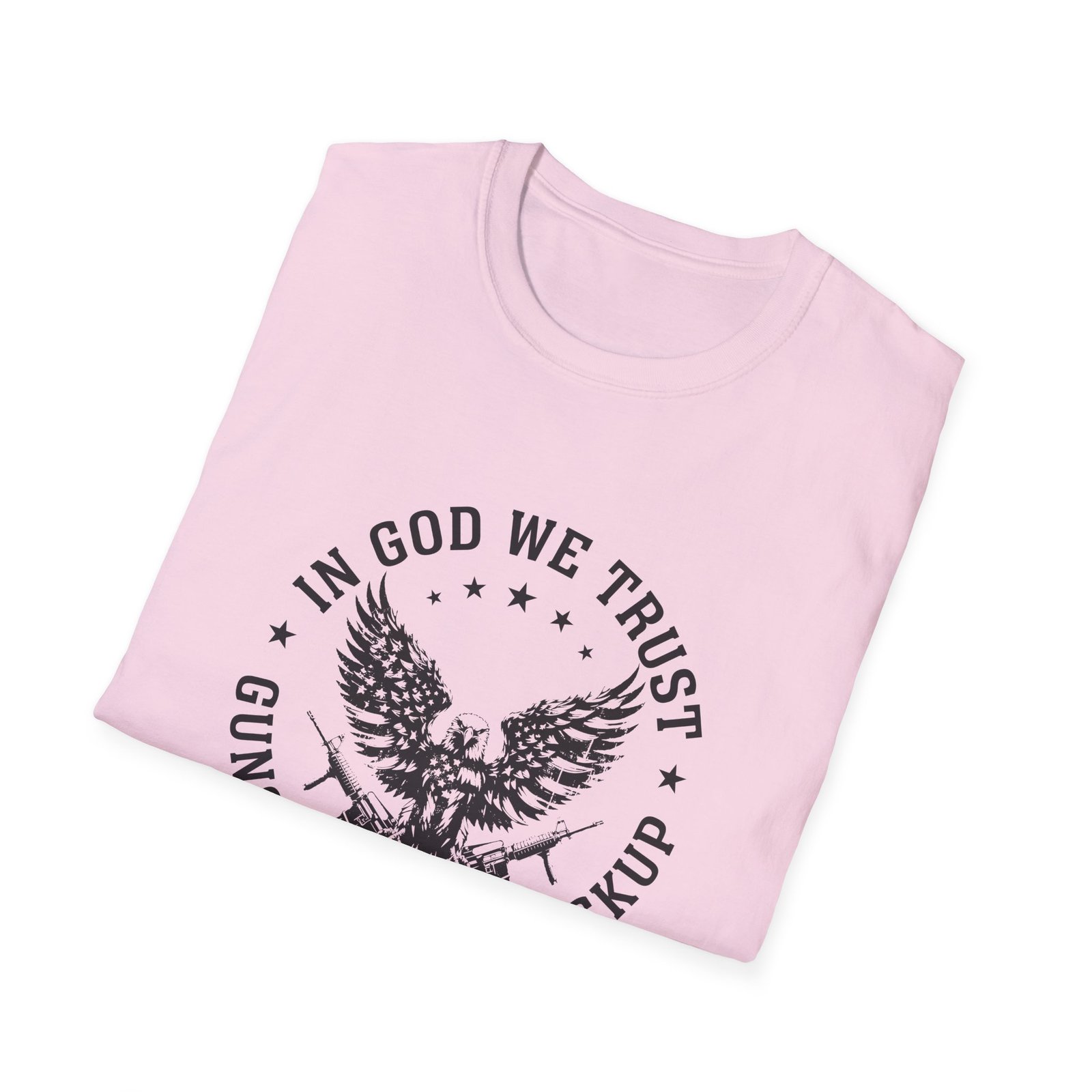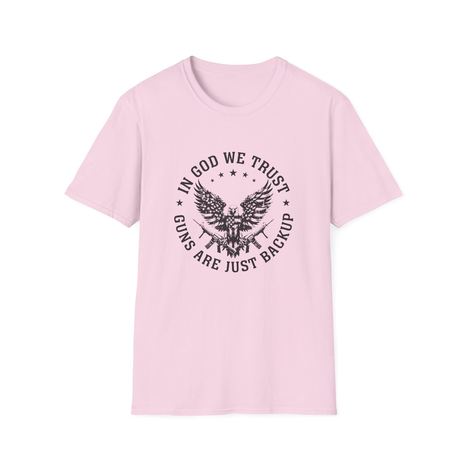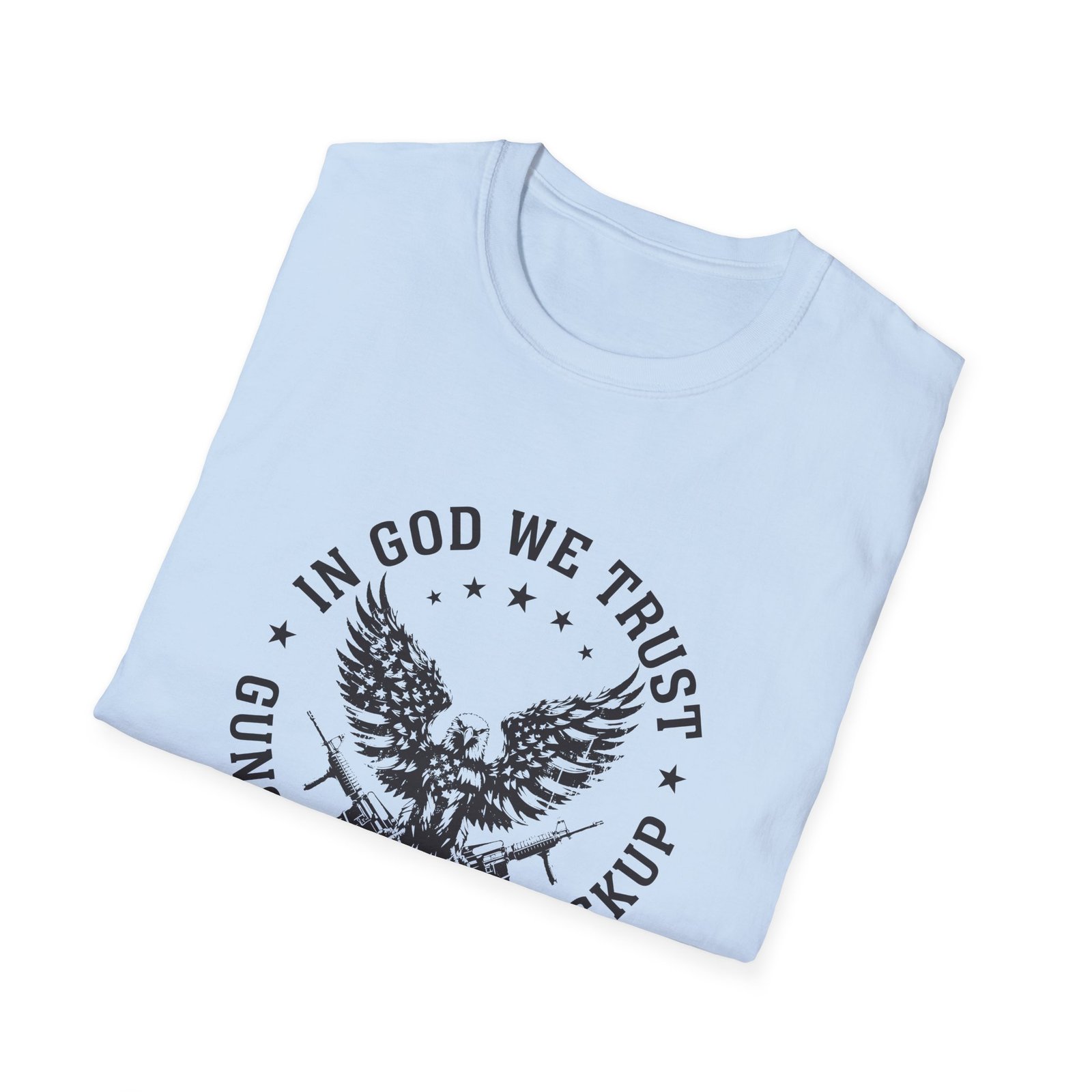 This lightweight tee carries a bold, unapologetic spirit. A weathered eagle clutching rifles sits at the center, ringed by the line “In God We Trust — Guns Are Just Backup.” It’s the kind of shirt that reads like a statement you’ve lived with: stubborn, protective, and steady. Wear it on a weekend at the range, layered under a flannel at a backyard cookout, or as a grounded piece on a road trip through open country. The soft ring‑spun cotton drapes easily and feels worn‑in from the first wear, so the message comes across without fuss. Subtle distressing in the print gives a vintage, broken‑in look that fits into workwear and casual wardrobes alike.